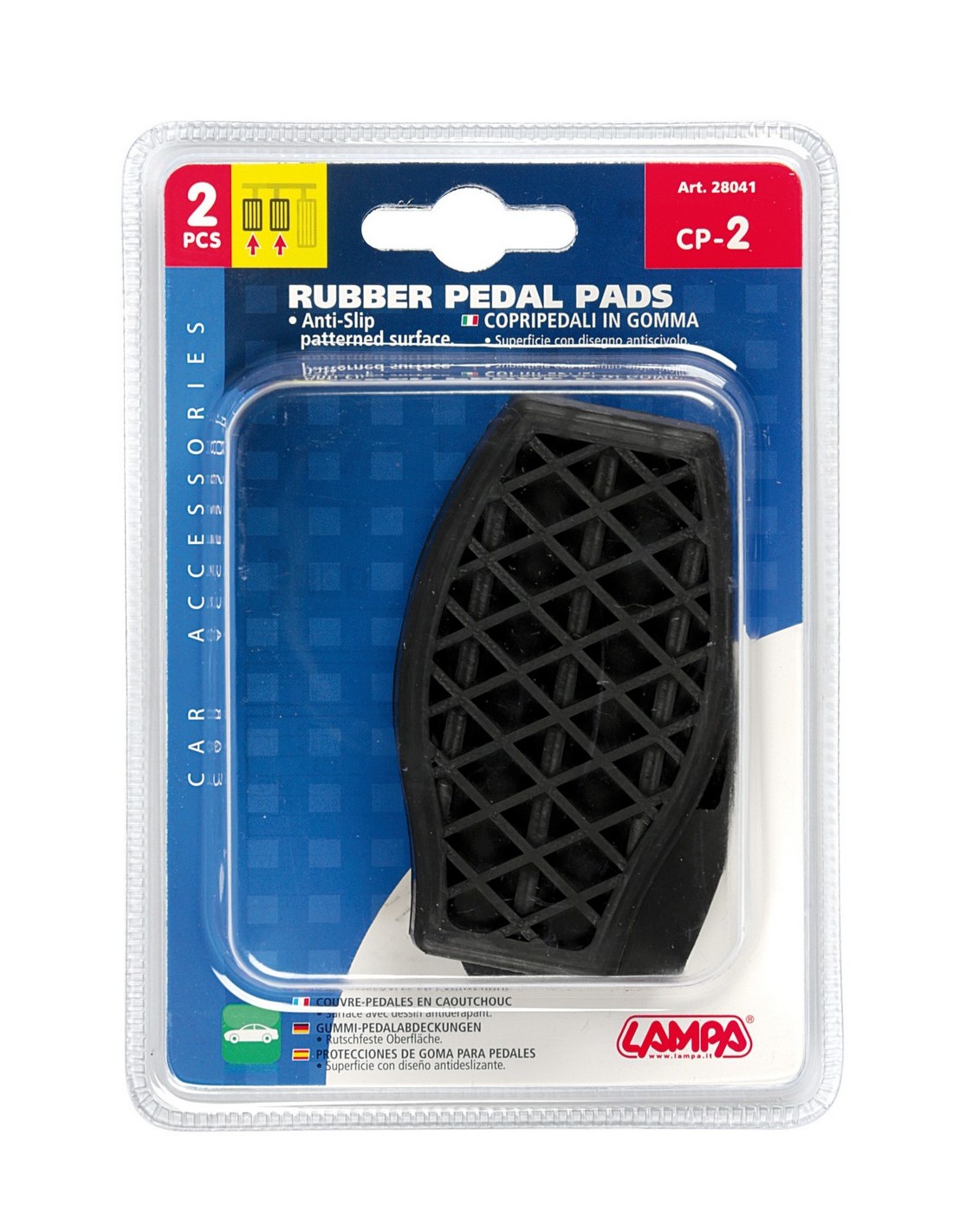 In gomma, adatti per sostituire perfettamente i copripedali originali del freno e della frizione. Superficie con disegno antiscivolo. Sistema di montaggio specifico per ogni modello di auto.