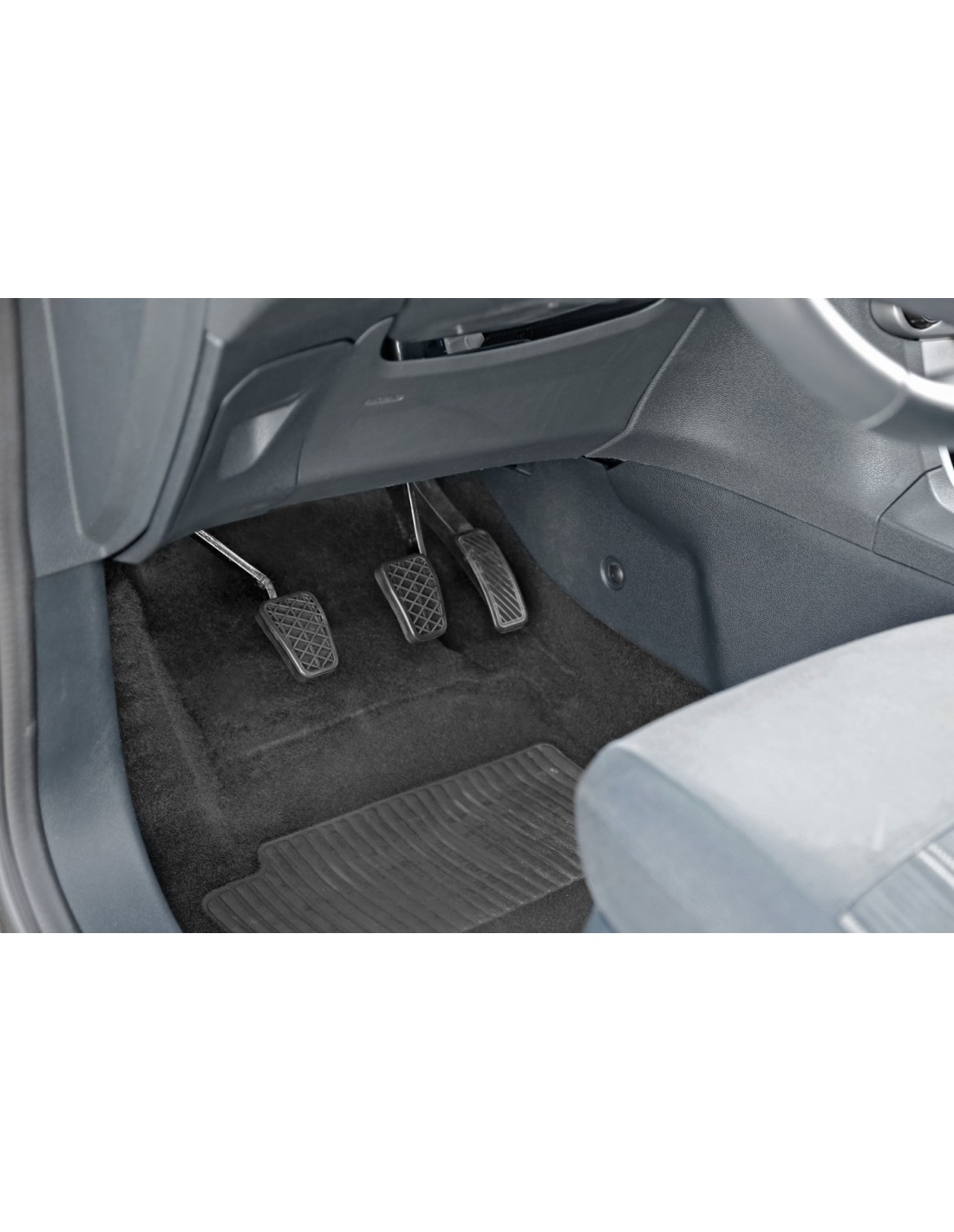 In gomma, adatti per sostituire perfettamente i copripedali originali del freno e della frizione. Superficie con disegno antiscivolo. Sistema di montaggio specifico per ogni modello di auto.
