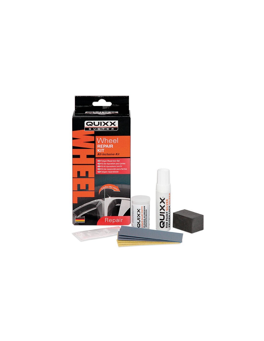 Quixx Wheel Repair-Kit ripara velocemente i danni ai cerchi in lega. Graffi profondi 1 millimetro o meno possono essere rispristinati facilmente. Lo stucco contenente alluminio ripristina la bellezza del cerchio originale in modo sicuro e veloce. L’area dovrà essere levigata con la carta abrasiva in dotazione e poi verniciata con la penna inclusa nel kit. • Nuova formula “Liquid Aluminium Technology”. • Lo stucco usato per la riparazione si mescola con l’alluminio della ruota in maniera omogenea e permanente raggiungendo lo stesso livello di consistenza.