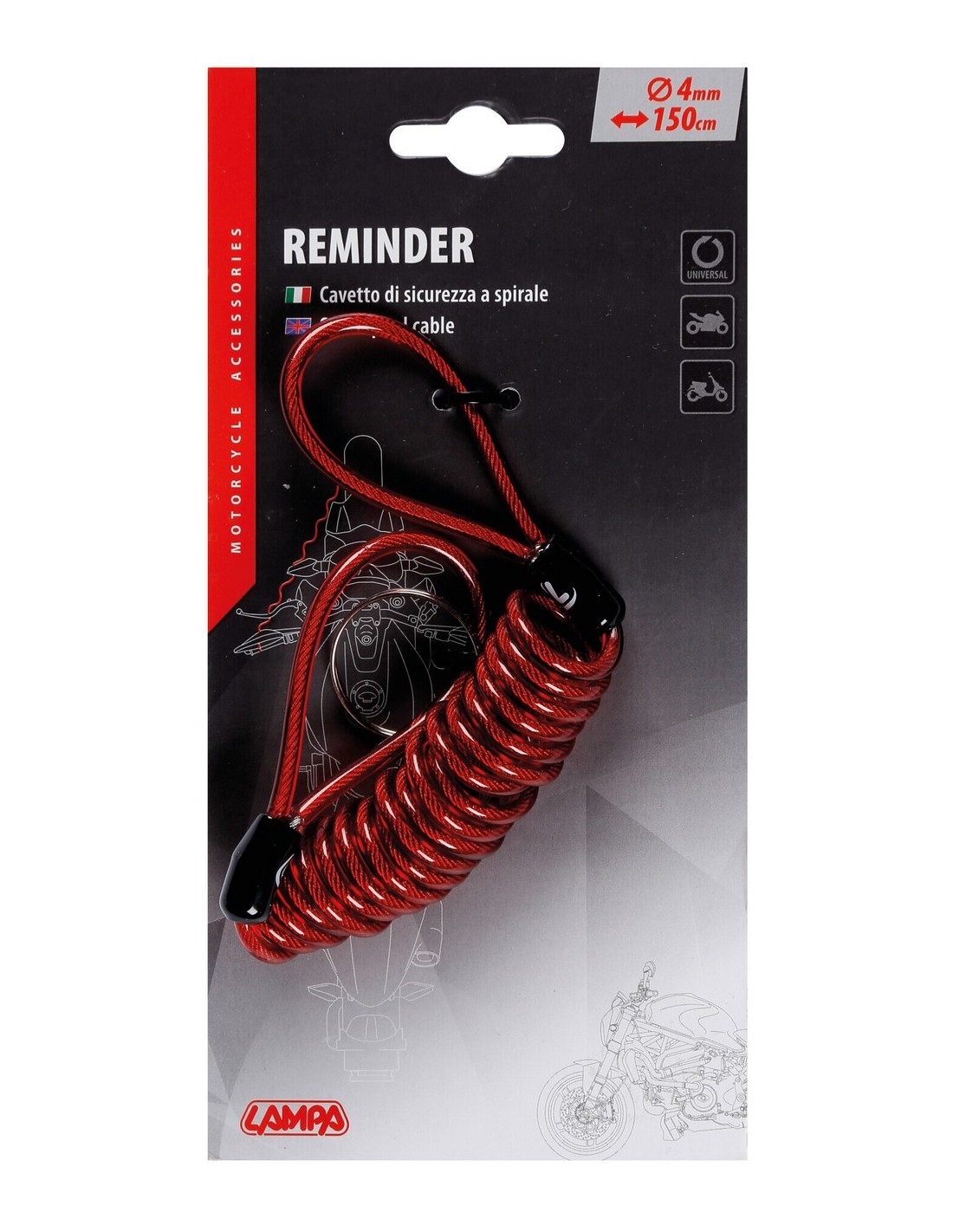 Doppia funzione: • Per ricordare al motociclista che sulla moto è installato l’antifurto meccanico • Antifurto per casco (lucchetto da ordinarsi a parte)