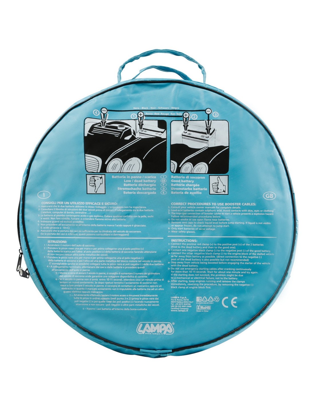 Con pinze di sicurezza isolate da 500 A. Molla delle pinze in acciaio temperato per una presa sicura sui poli batteria. Completi di pratica borsa/custodia