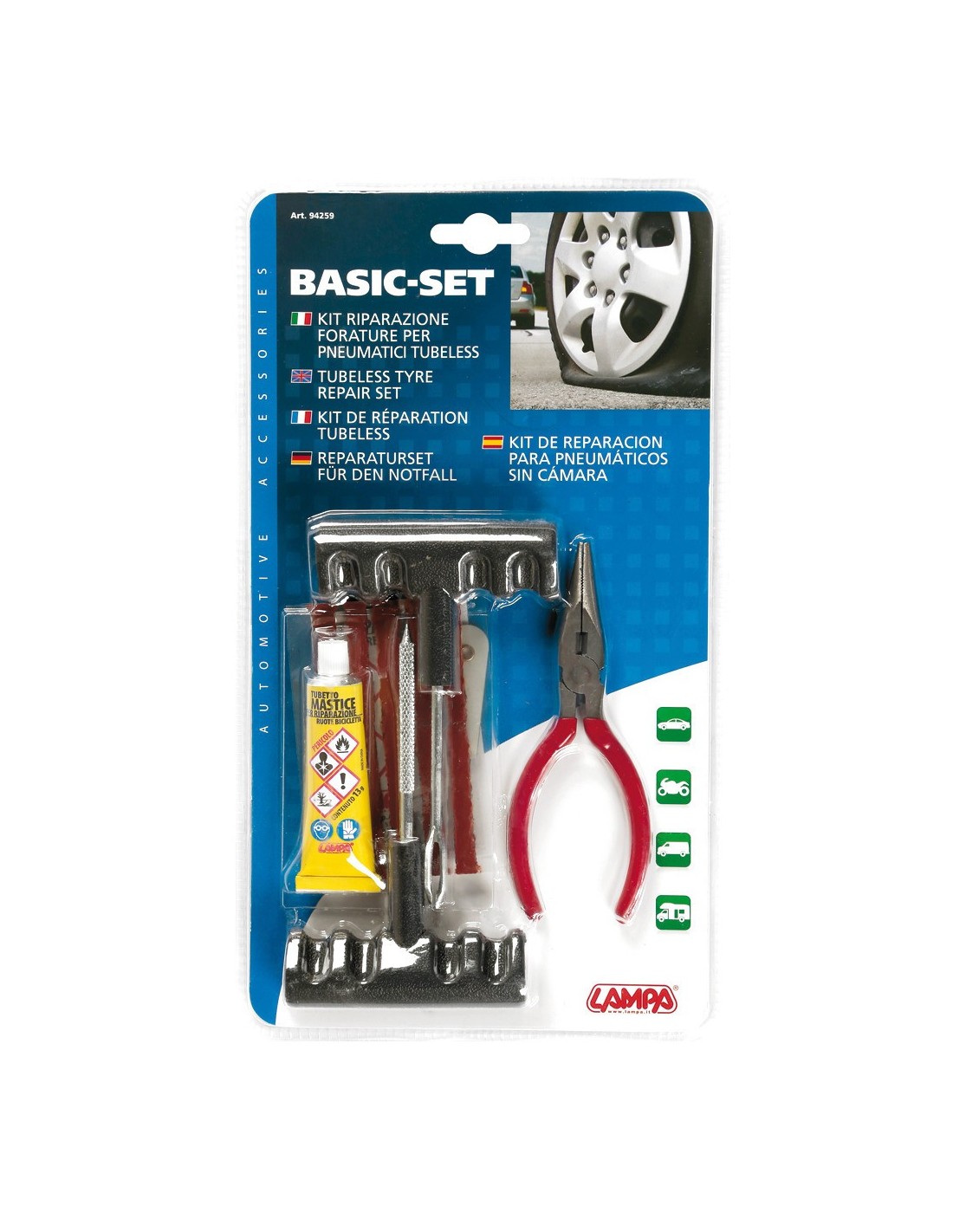 Il kit comprende: 1 pinza, 1 punteruolo per pulire ed allargare il foro da riparare, 1 sonda inserimento otturatore, 1 tubetto di mastice da 13 g, 5 otturatori, 1 cutter