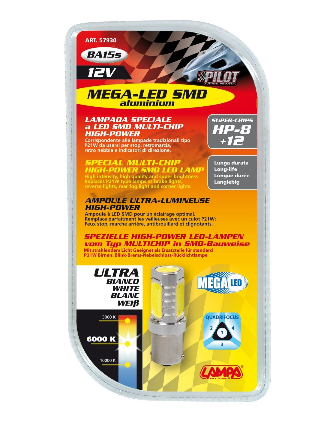 12V Led Series - 8 super chips + 12 chips - (P21W) - Quadrifocus - BA15s - 1 pz  - D/Blister - Bianco