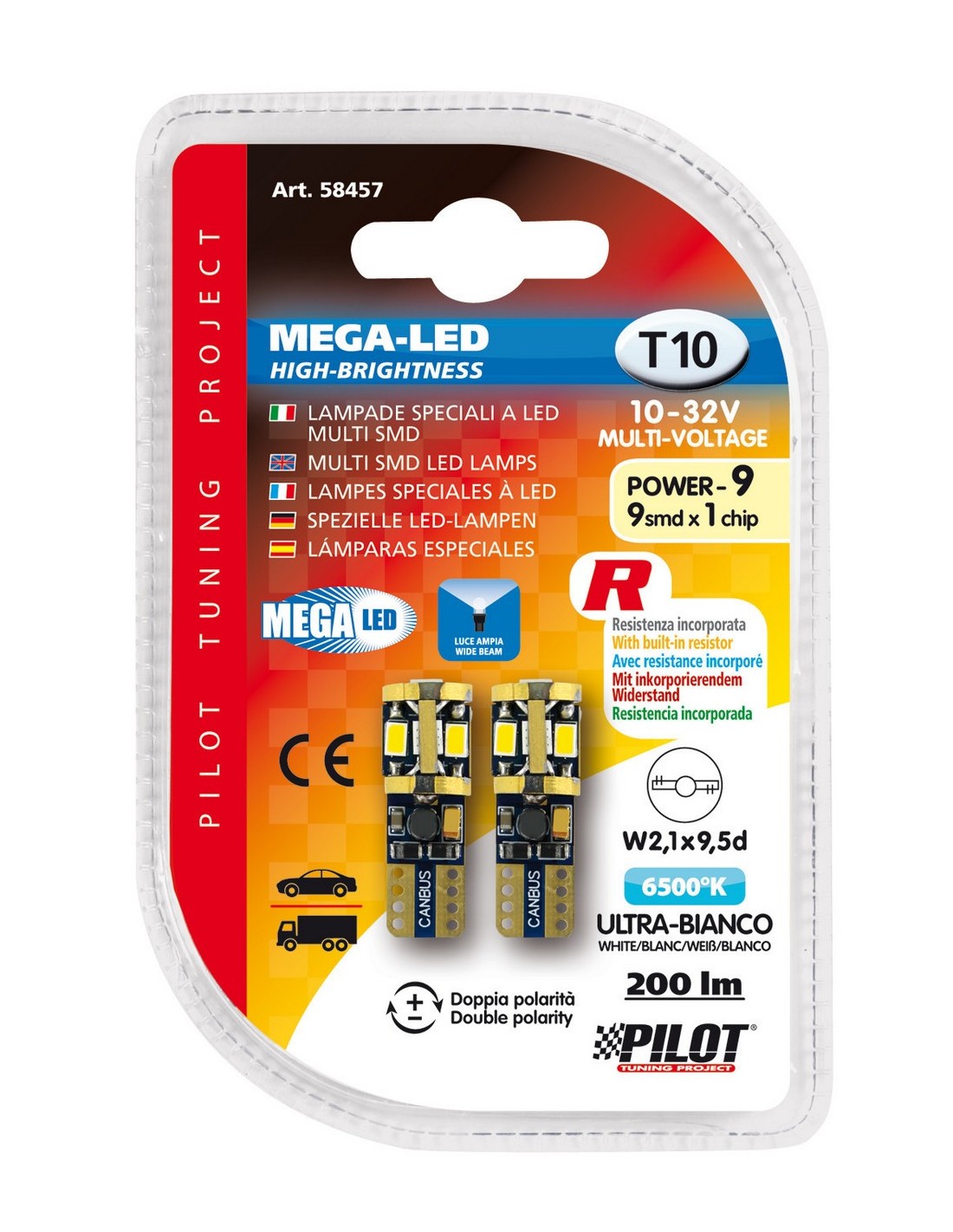 10/32V Mega-Led 9 - 9 SMD x 1 chip - (T10) - W2,1x9,5d - 2 pz - D/Blister - Bianco - Doppia polarità - Resistenza incorporata