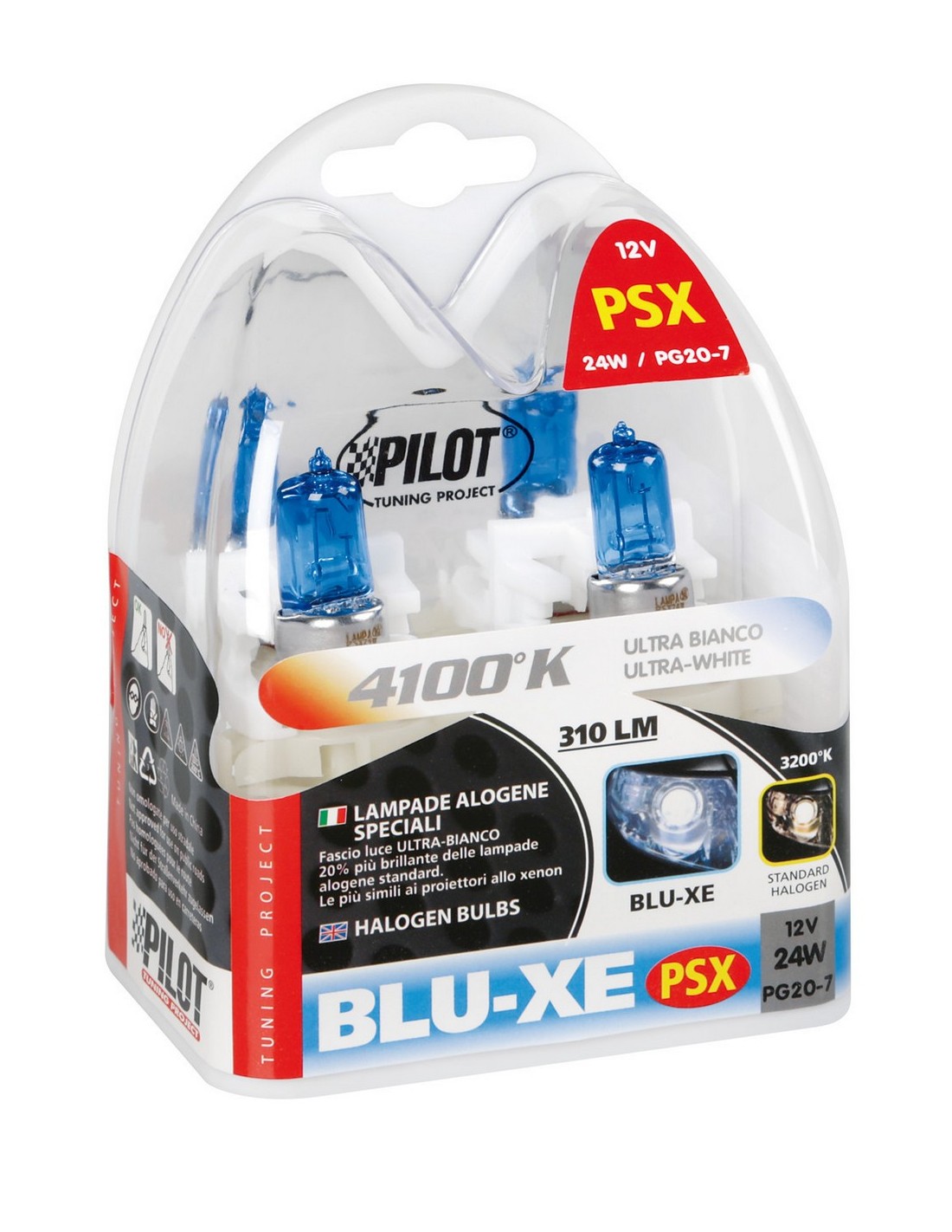 Fascio luce ultra-bianco, simile alle lampade xenon. Alta luminosità, 20% più brillantezza delle tradizionali lampade alogene. È sufficiente sostituire le tradizionali lampade di serie con Blu-Xe ed ottenere un fascio luce ultra-bianco simile ai proiettori a scarica di gas (HID)