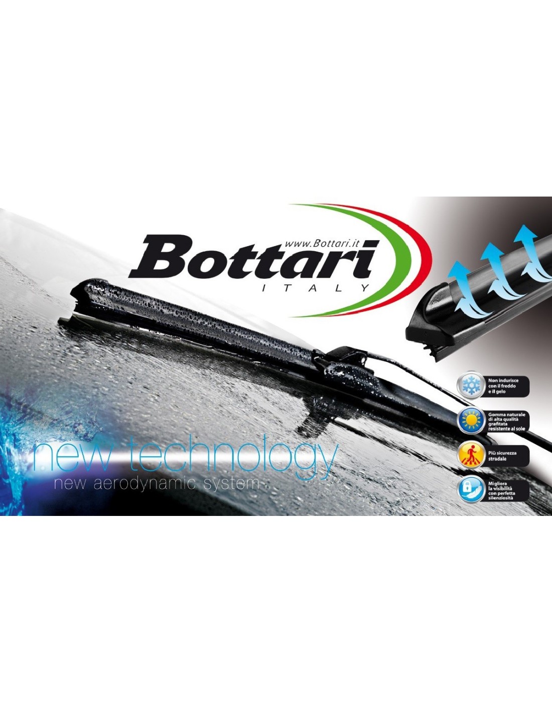 BOTTARISpazzole tergicristallo Element, universali con struttura interna d'acciaio: si adatta con precisione ad ogni parabrezza, garantendo bilanciamento e stabilità perfetti. Realizzata con una gomma di nuovissima formulazione con trattamento al teflon e grafite, resistente al caldo, al freddo ed ai raggi ultravioletti. Adatta alle condizioni climatiche più estreme, ed al contempo dura fino al 50% in più di una spazzola convenzionale. Inoltre è molto più silenziosa. Il Design aerodinamico abbatte la rumorosità ed aumenta la stabilità alle alte velocità.