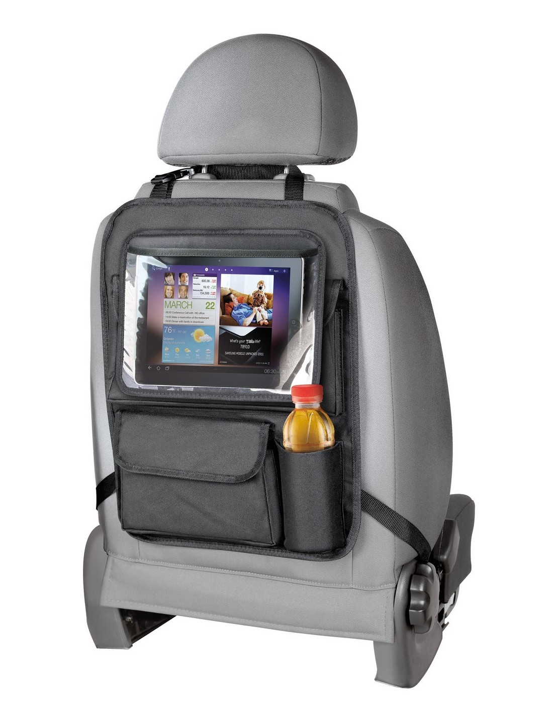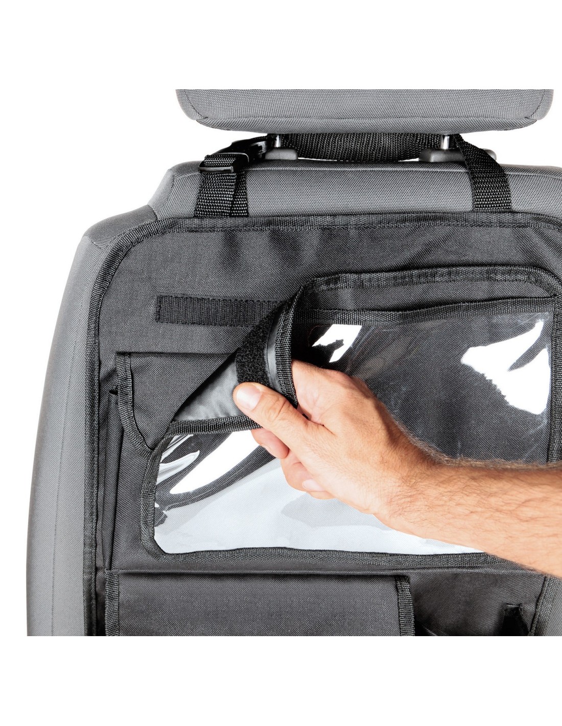 • 2 tasche per contenere tutto il necessario per il viaggio, 1 tasca portabevande e 1 tasca porta-tablet removibile, dotata di finestra trasparente idonea per funzioni touch-screen.