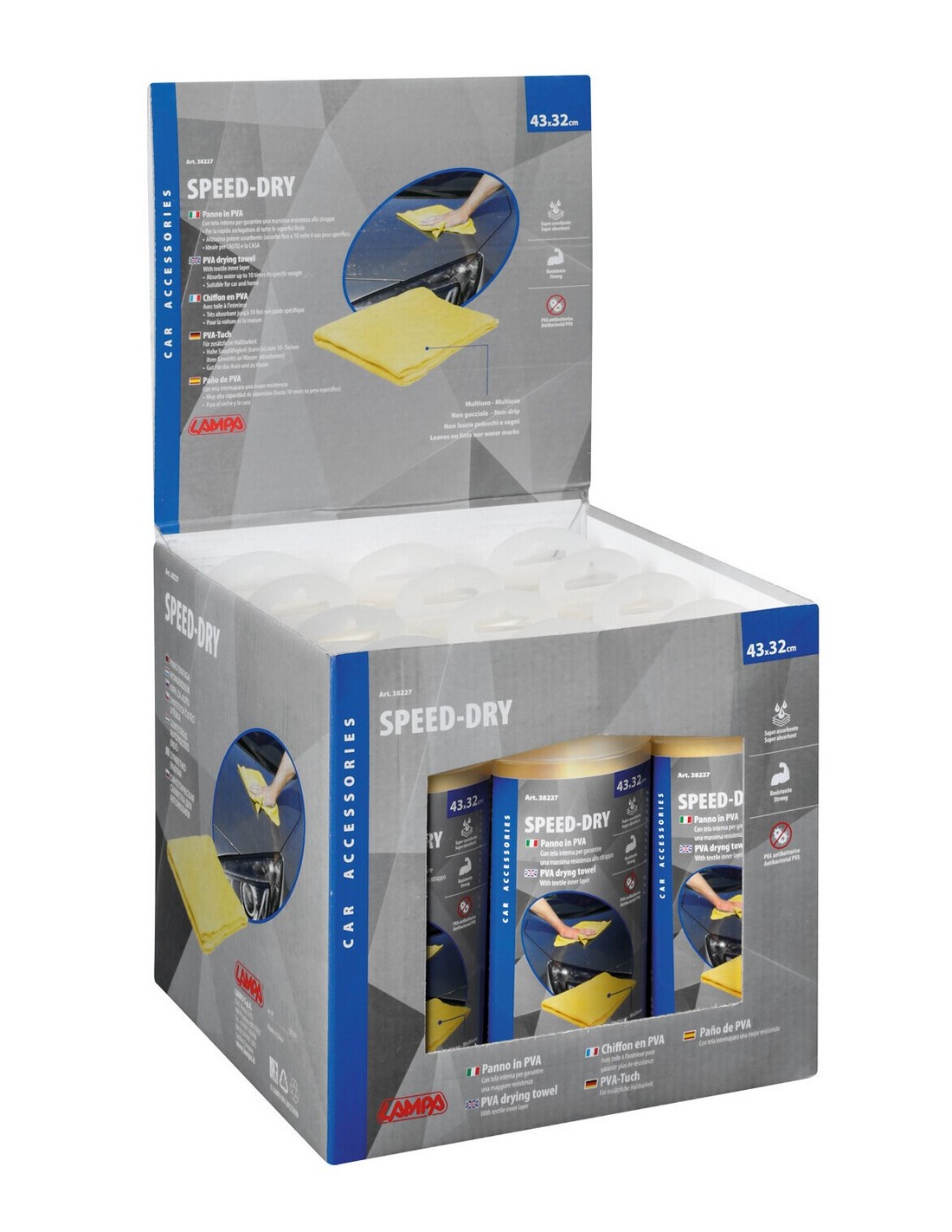 Panno scamosciato sintetico, con tela interna per una maggiore resistenza. Altissimo potere assorbente (fino a 9 volte il suo peso specifico)