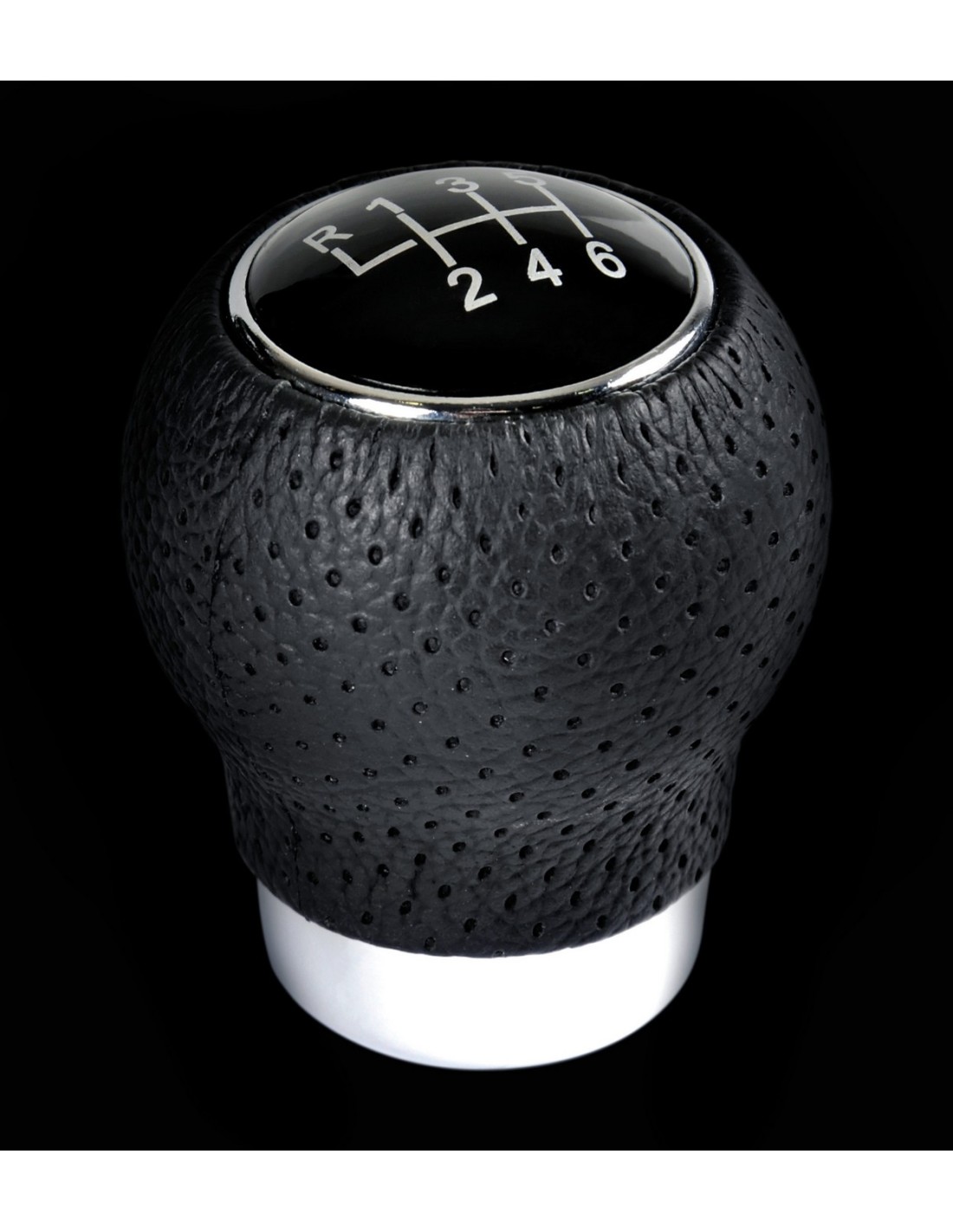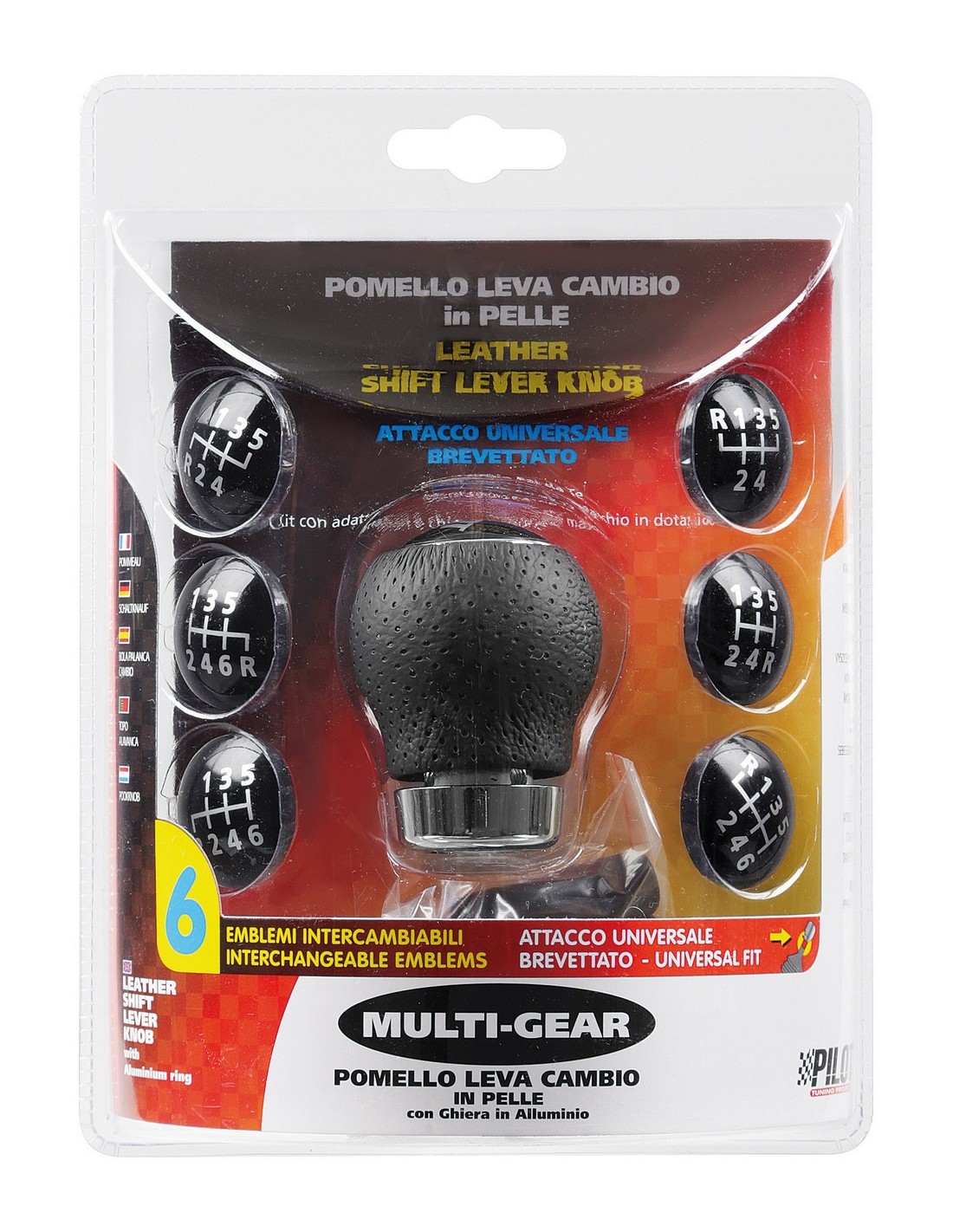 Pomello leva cambio alluminio e pelle. 7 emblemi intercambiabili. Montaggio fai da te tramite kit con adattatori e chiave esagonale in dotazione.