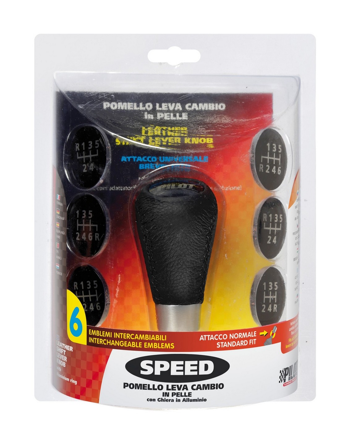 Pomello leva cambio in alluminio e pelle. 7 emblemi intercambiabili. Montaggio fai da te tramite kit con adattatori e chiave esagonale in dotazione. Attacco brevettato idoneo per leve cambio standard (Ø 15 mm max).