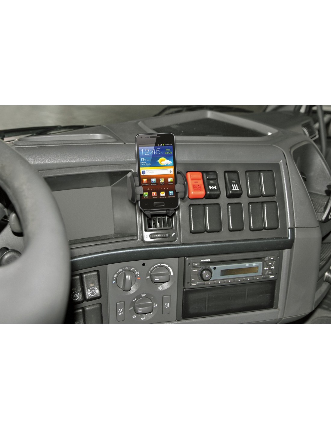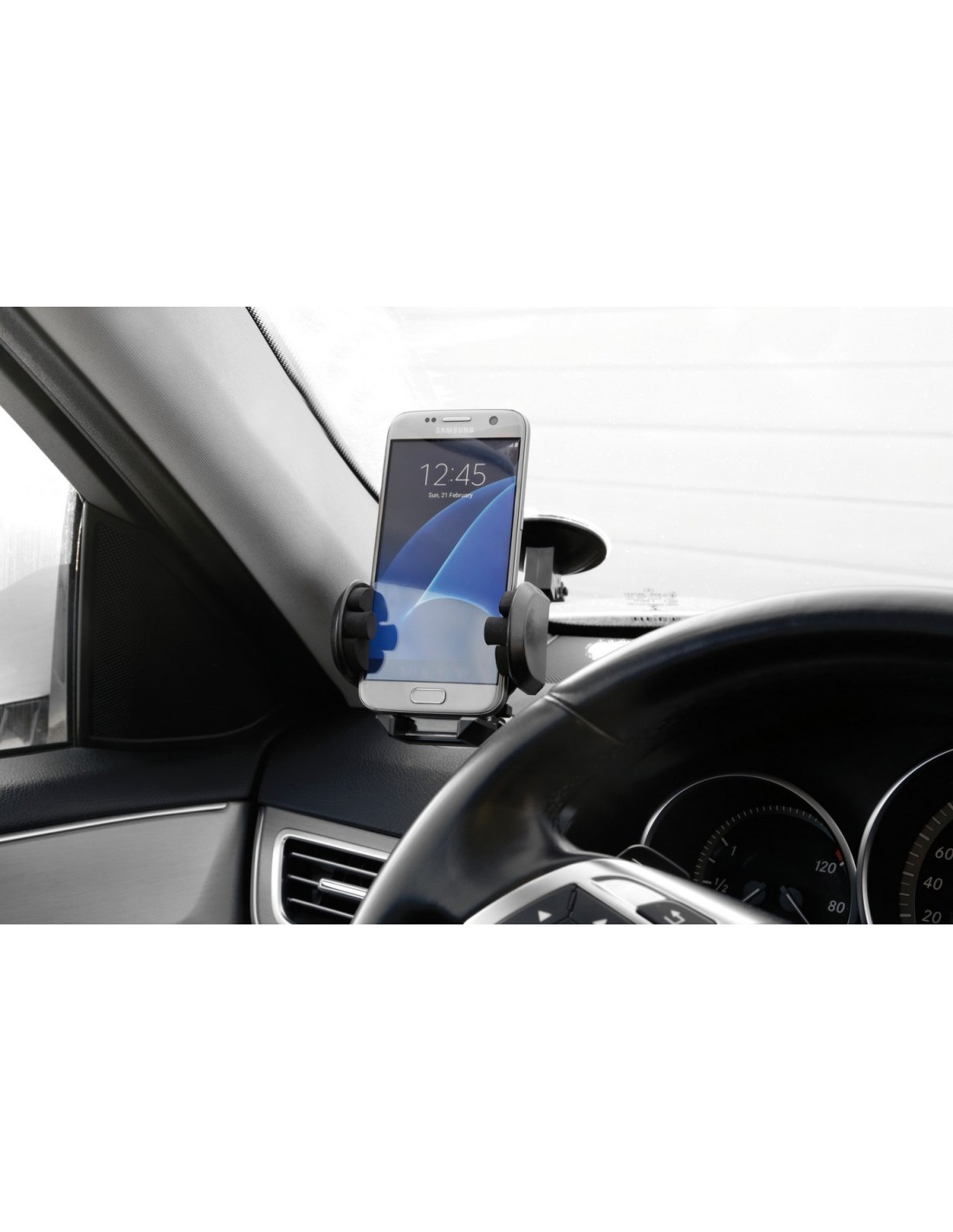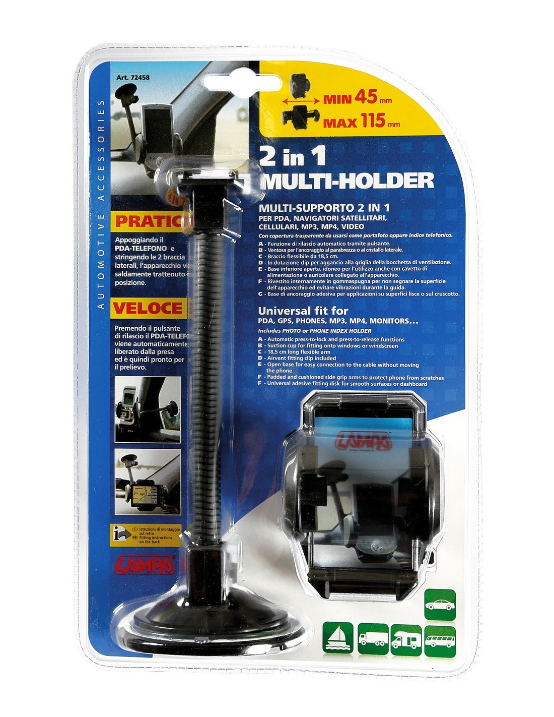 Rivestito internamente in gommaspugna. Idoneo per l’utilizzo con cavetto di alimentazione o auricolare collegato all’apparecchio. Funzione di rilascio automatico tramite pulsante. Fissaggio tramite clip per bocchette aerazione o ventosa per l’ancoraggio su superfici lisce.