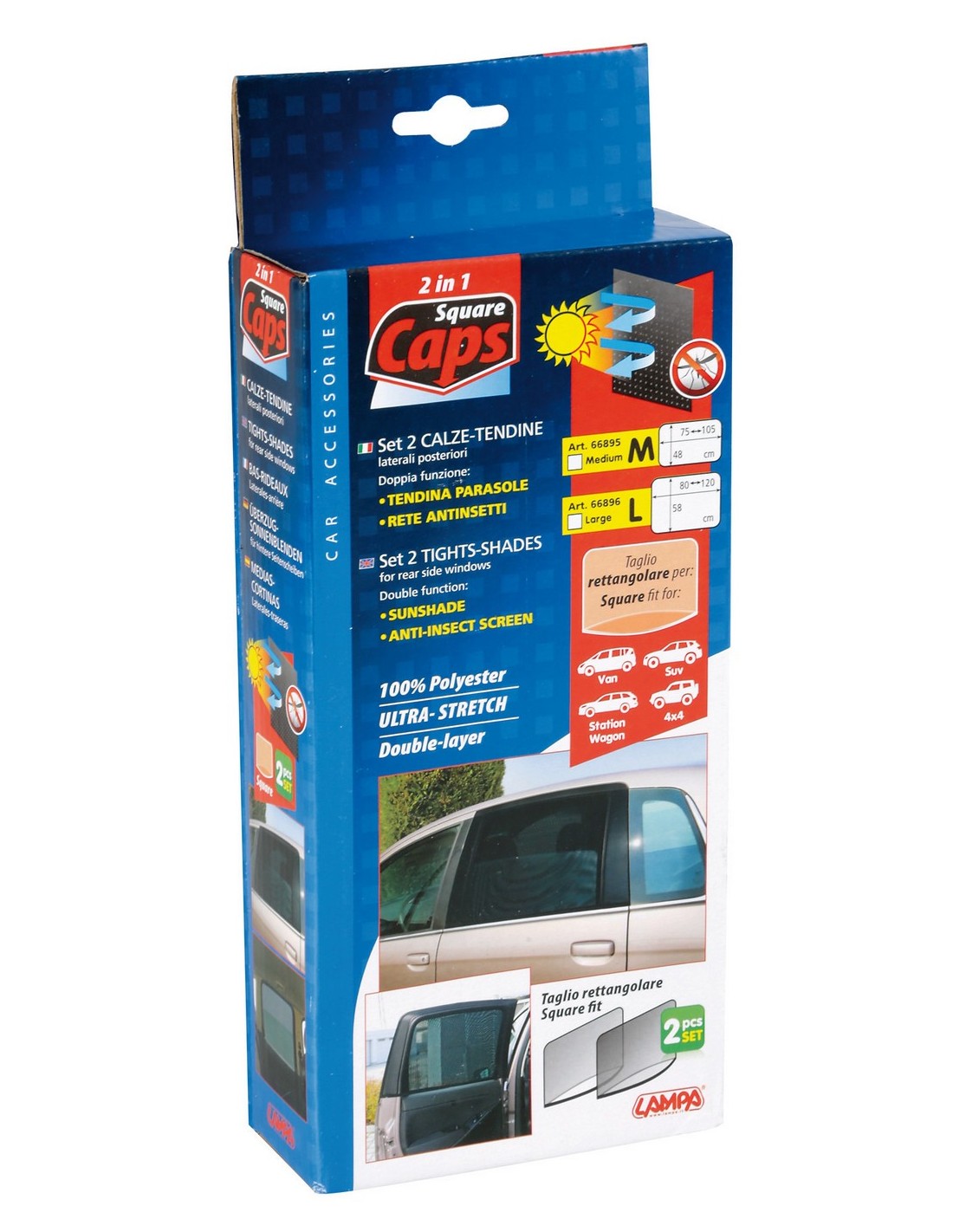 In 100% poliestere a doppio strato. Due funzioni: tendina parasole, per proteggere gli interni e i passeggeri dal sole, senza tuttavia bloccare la visibilità verso l’esterno; rete antinsetti, per non fare entrare gli insetti anche con i cristalli abbassati. Utilizzabile sui vetri laterali posteriori anche con vettura in movimento. Non intralcia la salita e la discesa del cristallo. Ripiegate su se stesse occupano poco spazio.